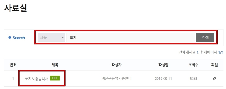 '자료실'에 들어오니 게시물이 꽤 많아서 원하는 글을 한 번에 찾기가 어려울 수 있어요. 이럴 땐 게시판 상단에 있는 검색 기능을 활용하는 게 가장 빠르고 정확해요. 검색 기준을 '제목'으로 맞추고, 검색창에 '토지'라고 입력한 뒤 검색 버튼을 눌러보세요. 그러면 우리가 찾던 '토지사용승낙서'라는 제목의 게시글을 바로 발견할 수 있을 거예요.