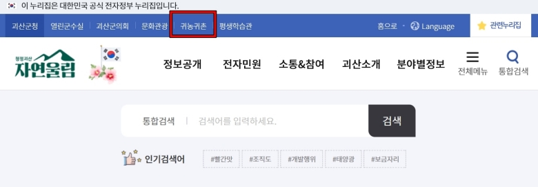지자체 홈페이지에 처음 들어가면 메뉴가 너무 많아서 어디부터 봐야 할지 막막하게 느껴질 수 있어요. 우선 '괴산군청' 사이트로 들어오셔서, 화면 상단에 나열된 여러 메뉴들을 한번 쭉 훑어보세요. 그중에서 '귀농귀촌'이라는 항목을 찾으시면 돼요. 보통 농지나 시골 땅과 관련된 서식들은 이쪽 분야에 모여 있는 경우가 많더라고요.