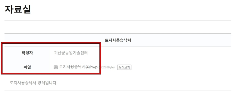 찾은 게시글 제목을 눌러 안으로 들어가면 상세 내용을 볼 수 있어요. 여기서 누가 이 자료를 올렸는지 작성자를 확인할 수 있고, 그 아래에 가장 중요한 첨부파일이 보일 거예요. '토지사용승낙서.hwp'라고 적힌 파일을 눌러서 본인 컴퓨터로 내려받으면, 드디어 우리가 찾던 양식을 손에 넣게 되는 거죠. 파일이 열리는 형식인지 미리 확인해두는 것도 좋은 습관이에요.