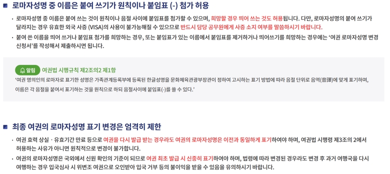 마지막으로 꼭 기억해야 할 점은, 한번 정해진 여권의 로마자 성명은 원칙적으로 변경이 매우 엄격하게 제한된다는 사실이에요. 이름은 각 음절을 붙여 쓰는 것이 원칙이지만, 음절 사이에 붙임표(-)를 넣는 것도 허용돼요. 처음 여권을 만들 때 신중하게 표기법을 확인하고 정해야 나중에 해외 출입국 과정에서 겪을 수 있는 불편함을 미리 예방할 수 있어요.