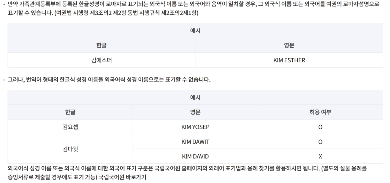 만약 '김에스더'처럼 외국어와 비슷한 한글 이름을 가졌다면 어떻게 될까요? 이 경우엔 외국어 이름 그대로 'KIM ESTHER'라고 표기할 수 있어요. 하지만 '김다윗'이라는 이름을 'KIM DAVID'처럼 전혀 다른 외국어 이름으로 번역해서 표기하는 것은 허용되지 않아요. 원래 한글 이름의 발음을 유지하는 선에서만 예외가 인정되는 셈이죠.