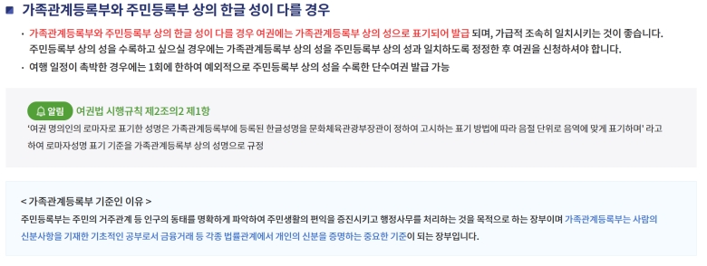 간혹 가족관계등록부와 주민등록등본상의 한글 성이 다르게 기재된 경우가 있을 수 있는데요. 여권에 표기되는 로마자 성명은 신분 사항의 기초가 되는 '가족관계등록부' 상의 성명을 기준으로 한다는 점을 꼭 알아두셔야 해요. 만약 주민등록등본상의 성을 사용하고 싶다면, 먼저 두 서류의 성을 일치시키는 절차를 거쳐야 해요.