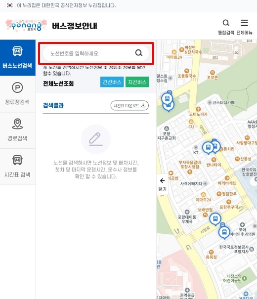 포항 시내버스 노선도 시간표 요금 검색 안내 (포항시 버스정보시스템)